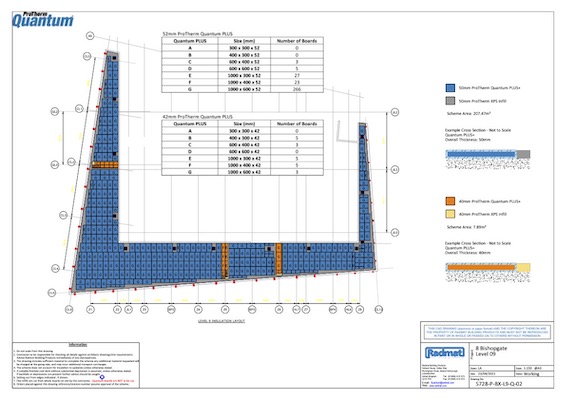 This working drawing for 8 bishopsgate show the intricate design plans for roof areas using ProThermQuantum Plus+ and XPS Infill insulation.