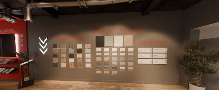 Integrated product display boards provide an overview of AKW’s wider kitchen offering, covering doors, worktops and handles. Direct access to brochures throughout the experience allows professionals to move quickly from concept review to detailed evaluation.
